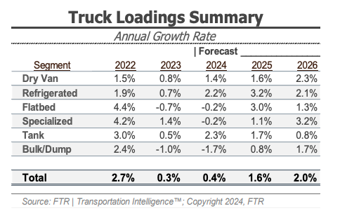 FTR made a slight downward revision to its 2024 truck loadings forecast, calling for total truckloads to grow 0.4% year-over-year, down from 0.6% last month. The dry van loadings forecast was revised downward, while the reefer and flatbed loadings forecasts both had positive revisions. The 2025 outlook remains strong, with overall truck loadings expected to grow by 1.6%.