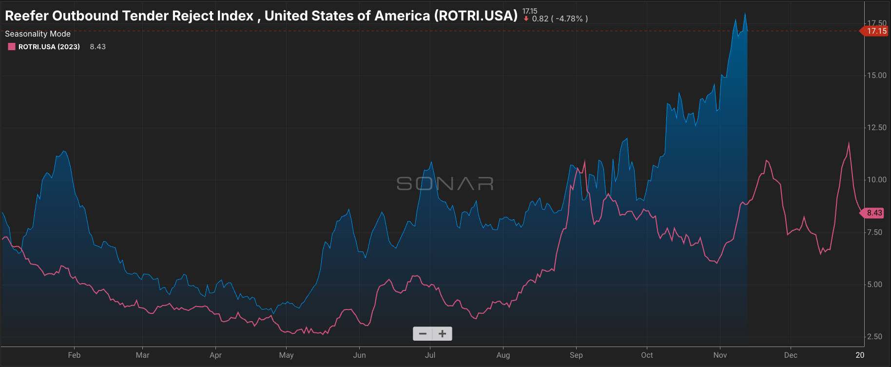 Reefer markets have not been this volatile since early 2022, as shown by large year-over-year increases in tender rejections, indicating routing guide challenges and rate volatility could intensify this winter.