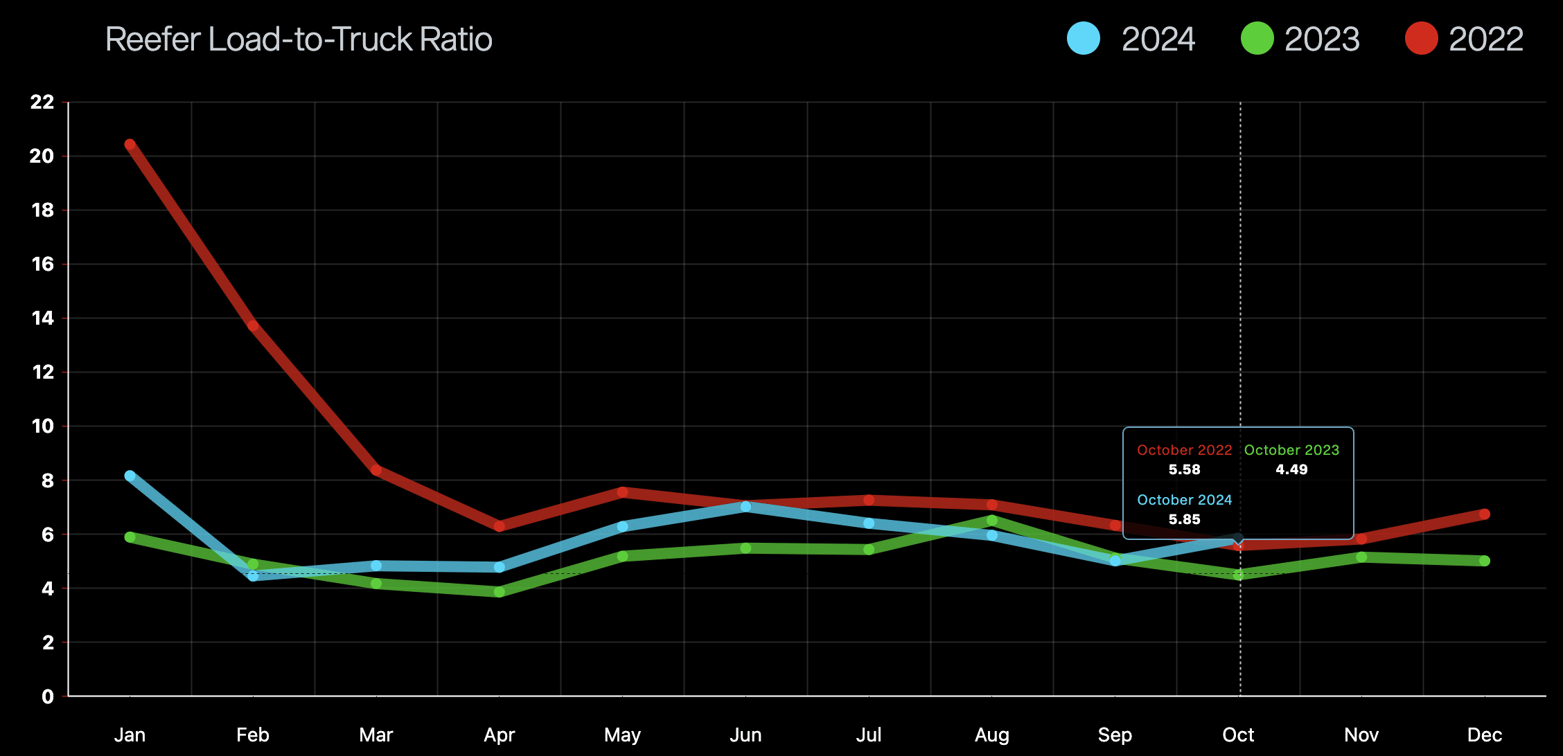Like dry van, reefer rejections ticked up in October, deviating from 2023 trends. Then, in early November, the index surpassed 17.0, nearly twice the November 2023 reading and the highest since April 2022. If this persists, the reefer market will become increasingly vulnerable to significant disruption this holiday season, and rates will likely rise meaningfully as volume grows through year-end.