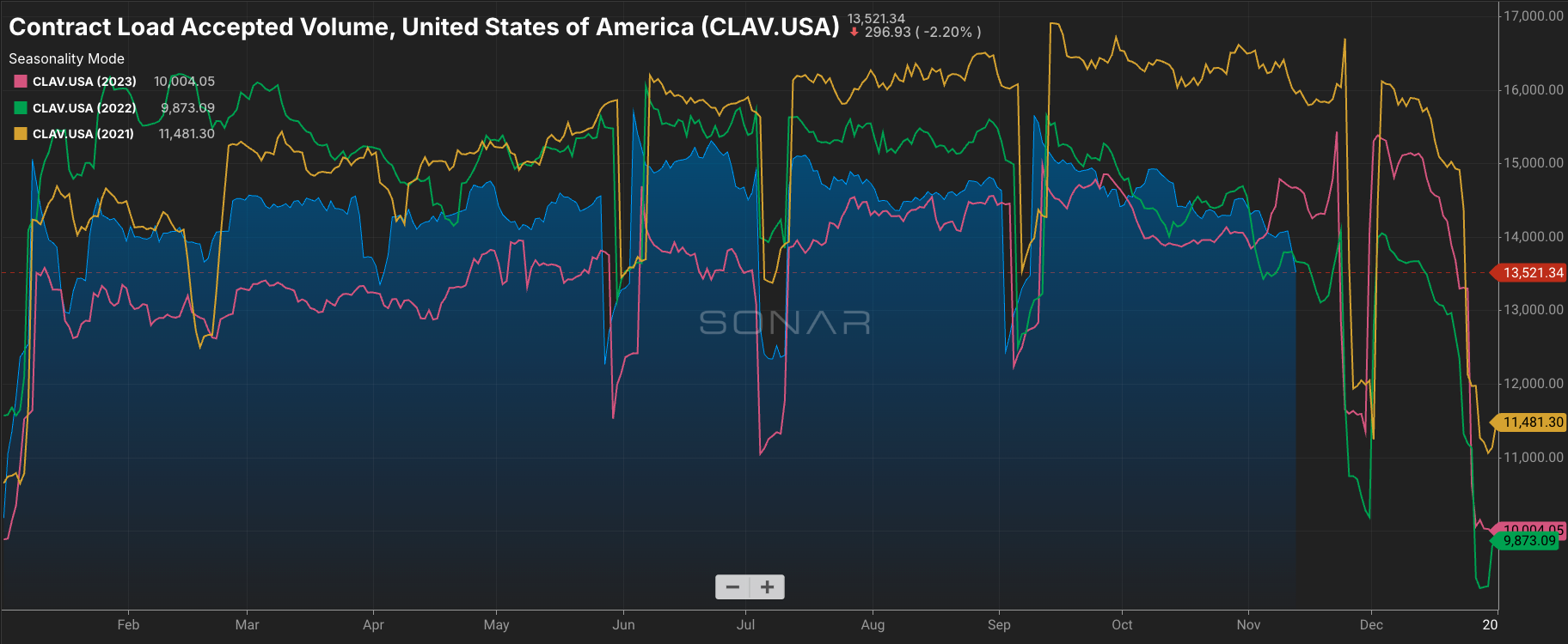 The Sonar Contract Load Accepted Volume Index (CLAV) measures accepted load tenders moving under contractual agreements. It is similar to the Outbound Tender Volume Index (OTVI) but removes all rejected tenders. The latest CLAV data shows demand followed typical seasonal trends in October and early November; the recent decline is normal as the market typically enters a brief lull ahead of Thanksgiving.