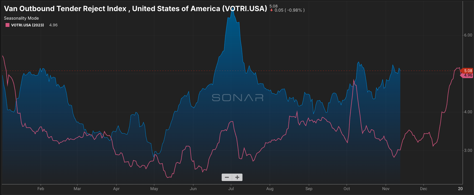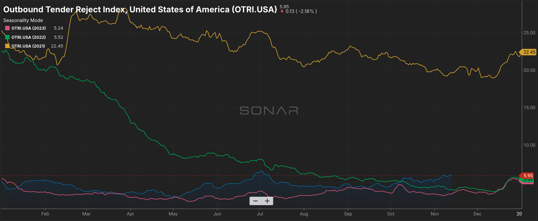 Dry van tender rejections remain relatively low amid strong supply, and increased carrier revenues during the holiday season will likely continue this trend.