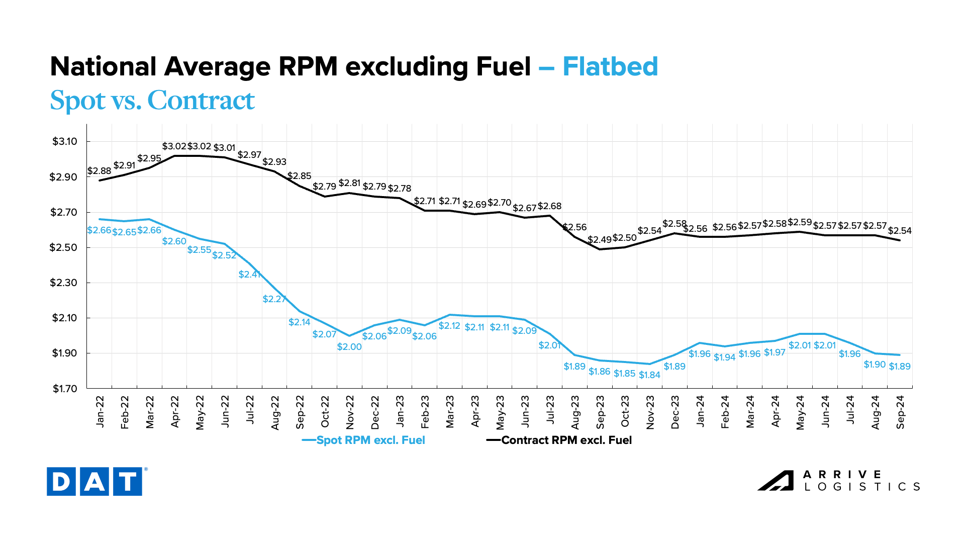 Freight market conditions are what we expected following Labor Day and a soft August. Rates followed seasonal expectations and should continue to for the remainder of 2024. Demand is stable, but the contract market is stronger than the for-hire market. Supply is plentiful, and private fleets’ investment in expansion has enabled them to take more spot market share.