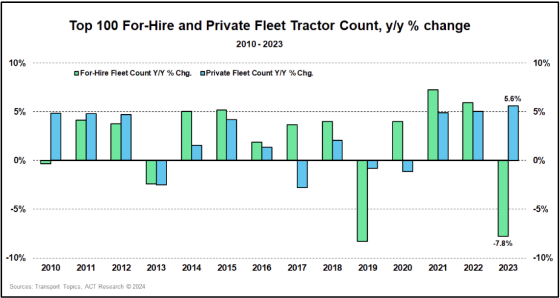 Investment in expanding tractor counts by private fleets is boosting their share of truckload volumes. This growth is reducing spot market demand and contributing to excess capacity in the market.