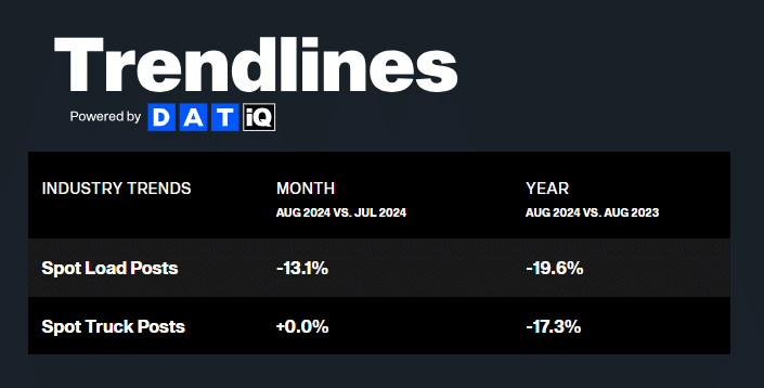 DAT reports that spot load postings fell by 13.1% month-over-month in August and were down nearly 20% from August 2023. The month-over-month decline follows seasonal expectations as August tends to be quieter than July. While the year-over-year decline seems large, it significantly improved from the 41.4% year-over-year decline in August 2023. This trend indicates that traditional spot load boards are experiencing reduced activity due to not only lower truckload volumes but other factors as well, such as theft risk, rate API utilization and private fleet insourcing.