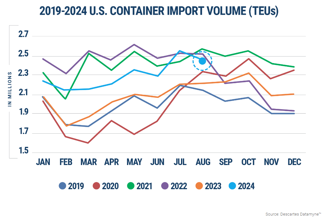 August import data from Descartes tells a story similar to the NRF forecast, showing import levels well above 2023 despite a significant pullback in August. Descartes also notes that imports through the first eight months of 2024 are up nearly 16% from the same time in 2019.