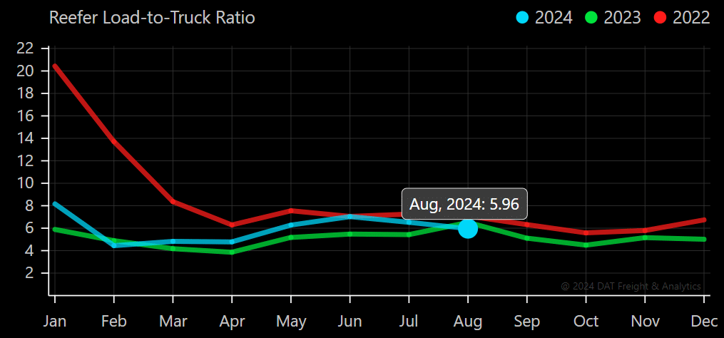 The DAT Load-to-Truck Ratio measures the total number of loads relative to the total number of trucks posted on its spot board. The dry van reading continued to decline, reaching 3.64 in August. This aligns with expectations, as decreased volume and stable capacity lead to lower load-to-truck ratios. Reefer markets followed a similar trend, with load-to-truck ratios falling to 5.96 in August.