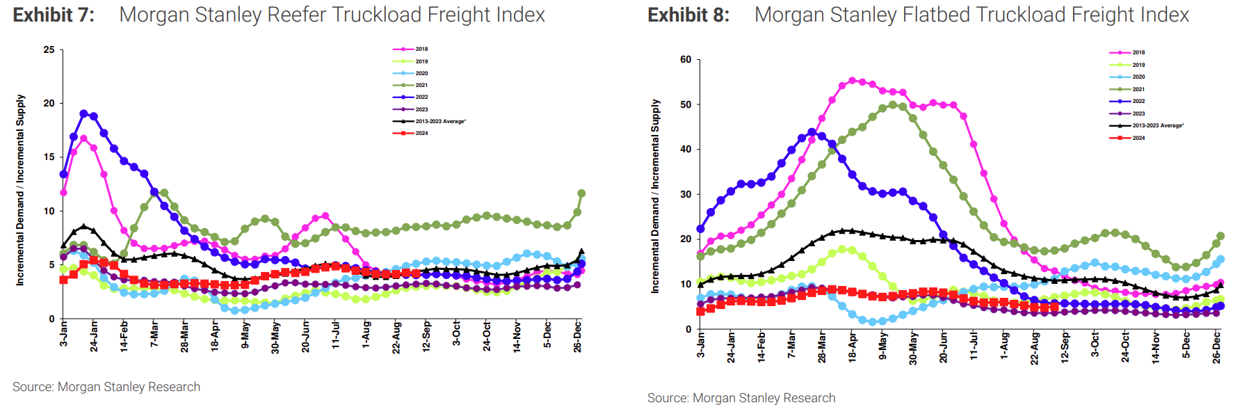 The reefer index continues to closely follow the 10-year average, while the flatbed index is well below the historical average but in line with 2023 levels.