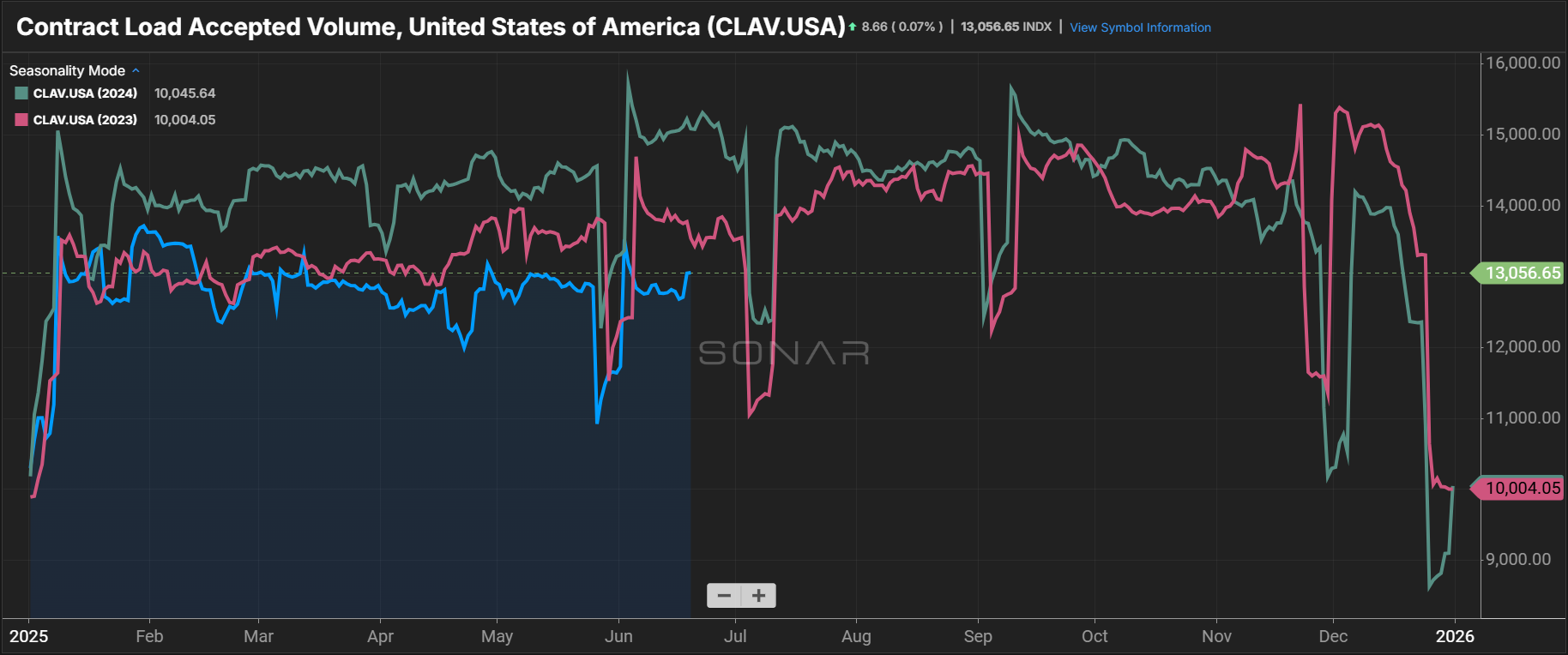 Truckload rates followed normal seasonal patterns in May. Weekly rate data showed a similar trend to last year, with elevated late-month activity giving way to softer conditions in early June as the urgency around Roadcheck Week and Memorial Day subsided.
