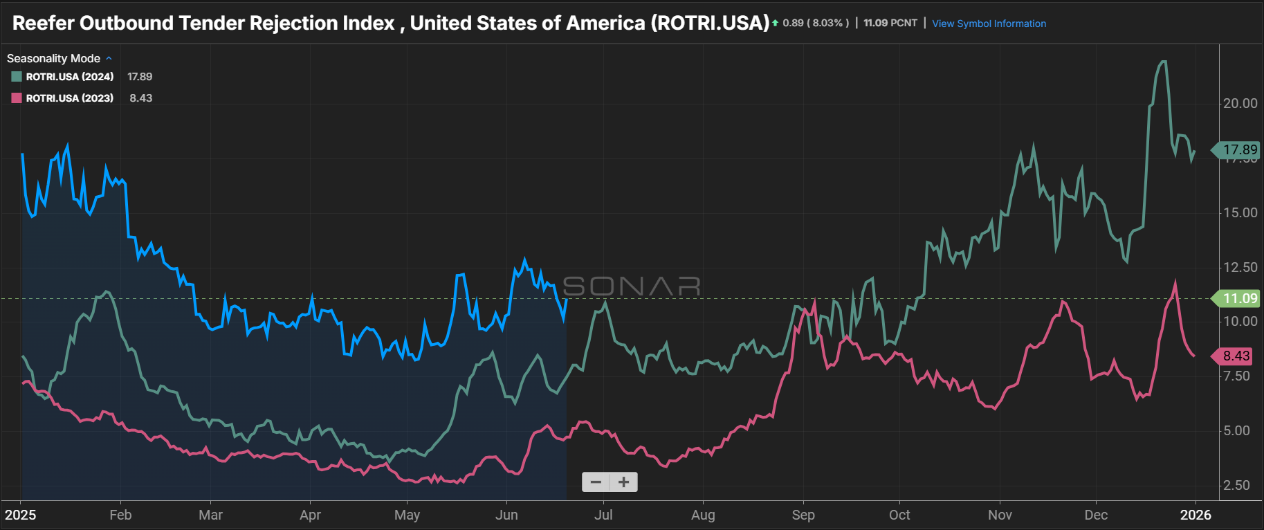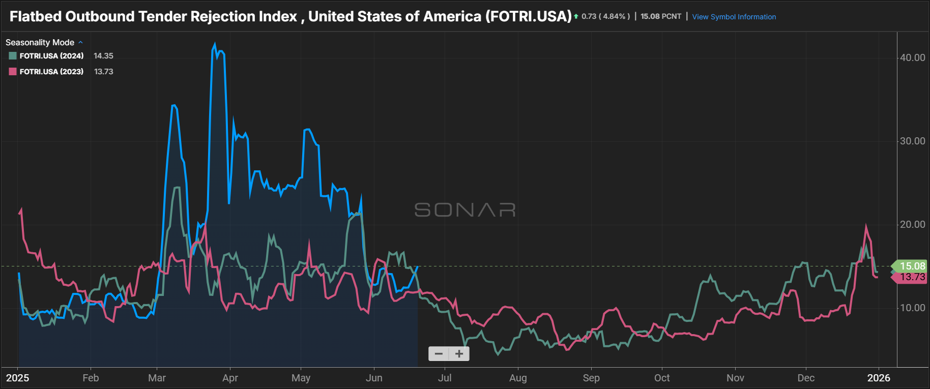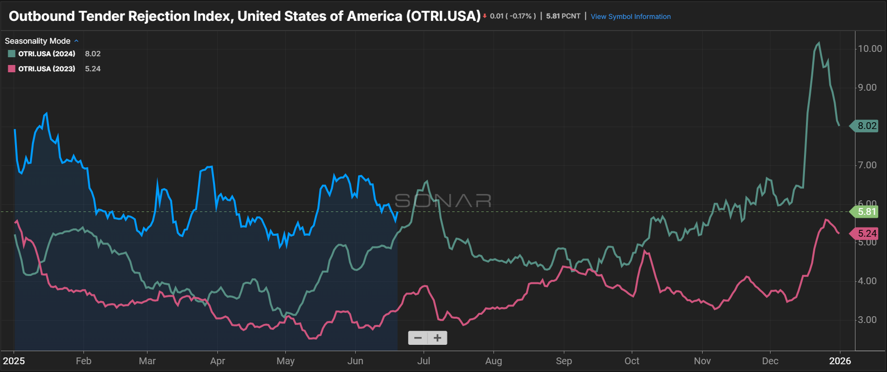 Still, with tender rejection rates fading toward 2024 levels and only regionalized seasonal demand surges making an impact to rates, national trends continue to reflect the broader narrative of weakening volumes and ample capacity.