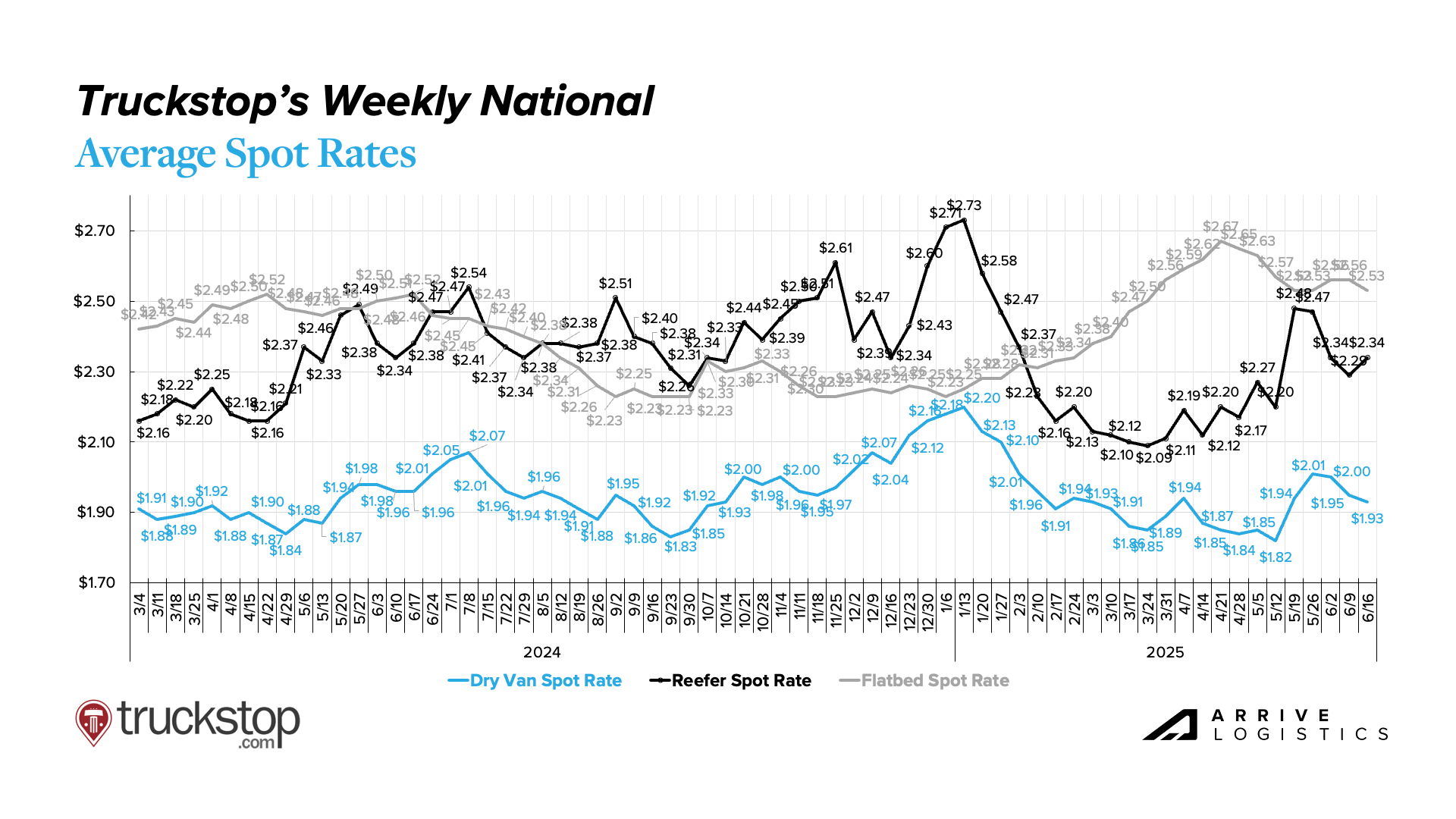 Normal seasonal supply trends also continued to play out in May and early June. Van and reefer load-to-truck ratios and rejection rates rose during Roadcheck Week—both month-over-month and year-over-year—and remained elevated through Memorial Day before easing as capacity returned to the market. Meanwhile, the flatbed market has finally cooled from recent peaks.