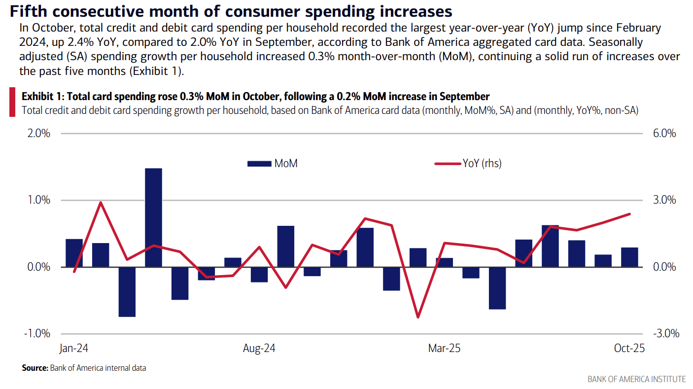 The government shutdown interrupted normal economic reporting, leaving gaps in CPI, labor and other macro indicators at the time of writing. However, Bank of America card data showed a fifth consecutive month of rising consumer spending in October, with per-household spending up month-over-month and year-over-year.