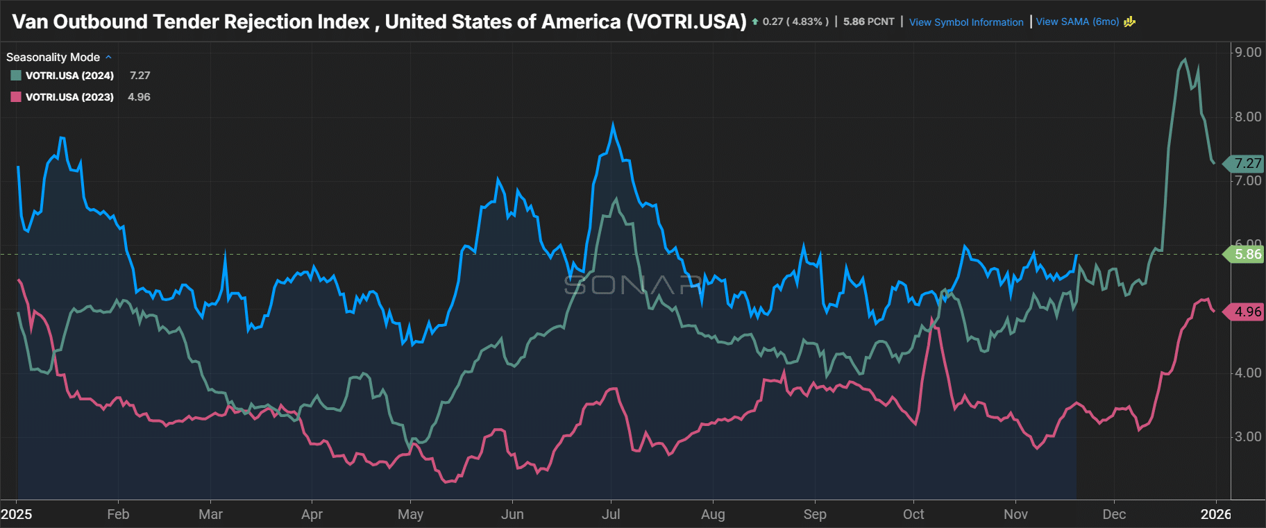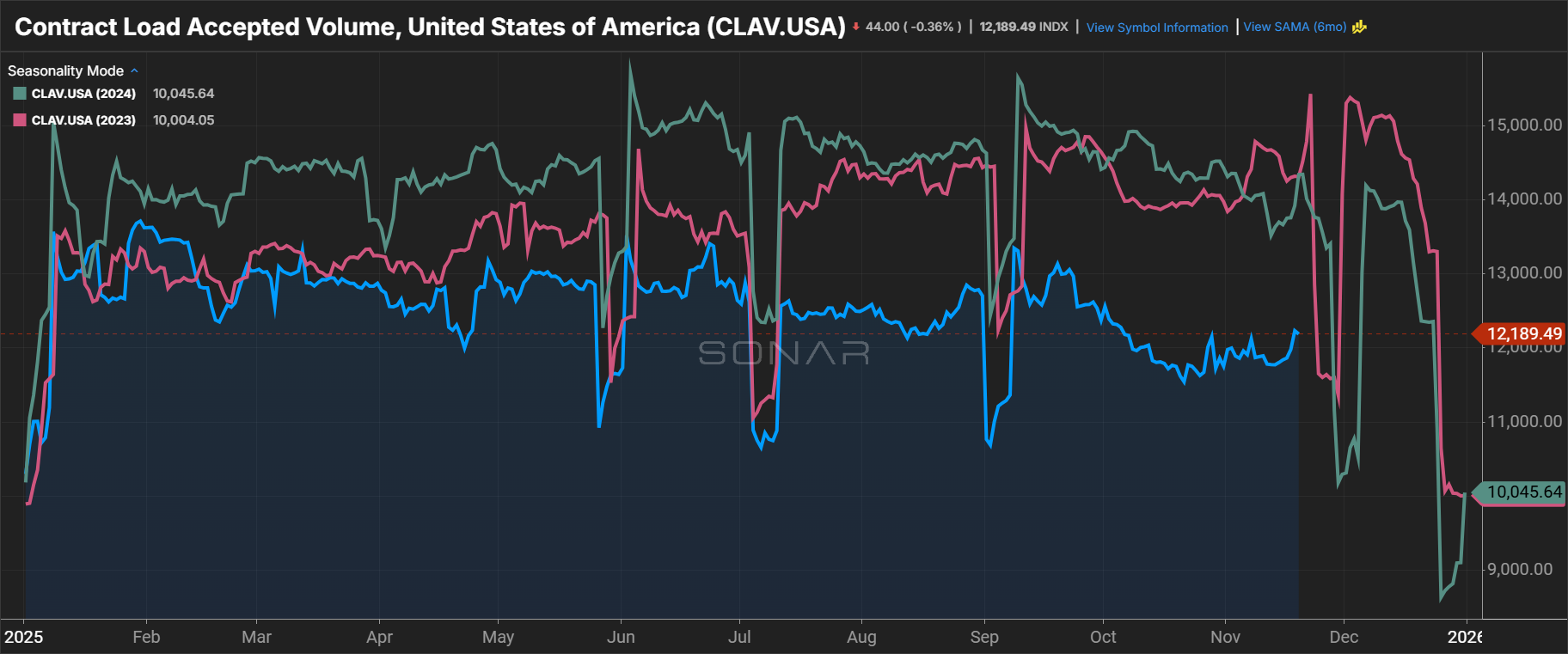 Reefer rejection rates followed normal seasonal patterns through October before falling in early November, with only pockets of tightness driven by seasonal food shipments and freeze-protect demand. With continued softness across other major modal markets, current capacity should easily cover short-term holiday or weather-related disruptions.