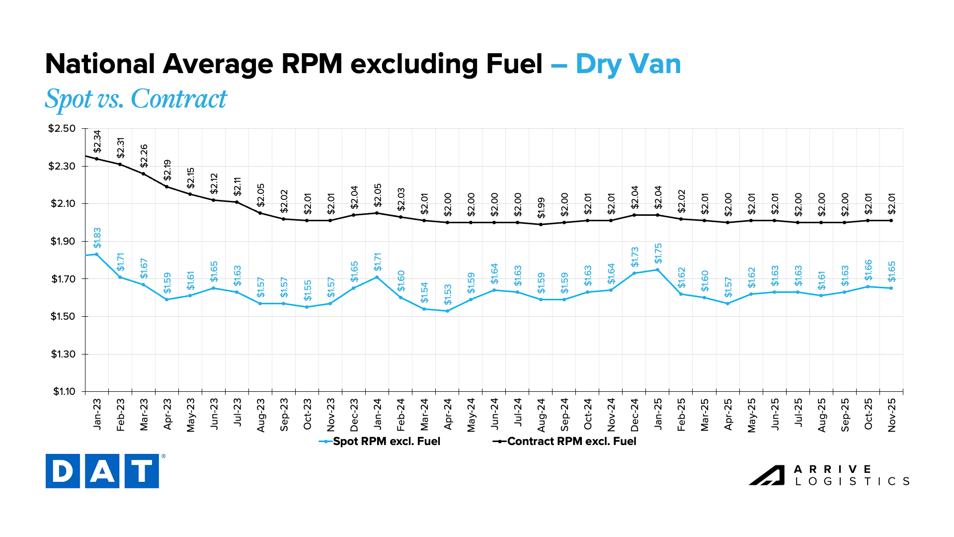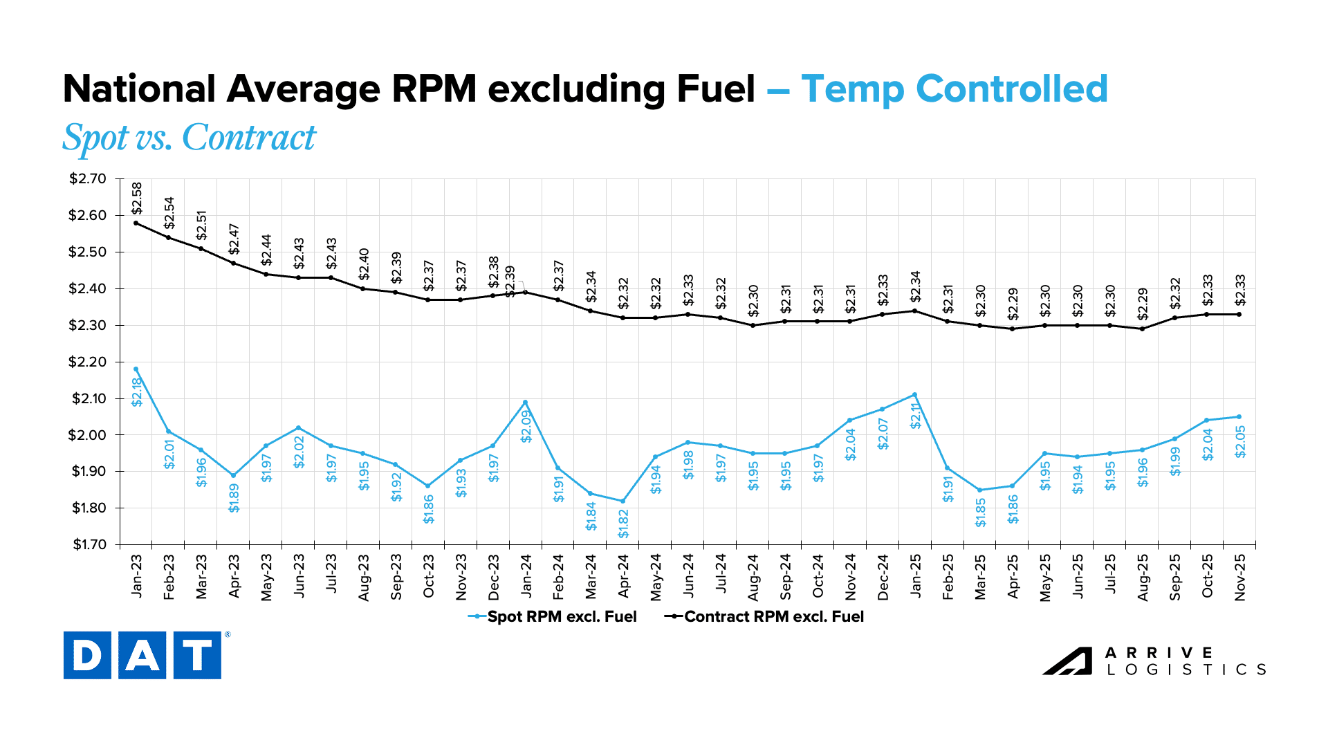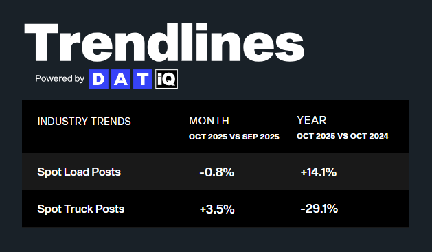 Volumes will likely remain soft through year-end, with volatility limited to typical seasonal patterns. That includes reefer tightness as holiday food demand rises, short weather-related bumps and van disruptions tied to annual capacity shutdowns in late December. Continued manufacturing contraction and a weak investment environment amid persistent tariff uncertainty remain the primary near-term downside risks to future volumes.