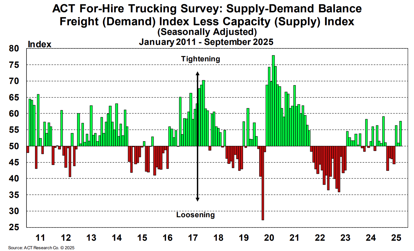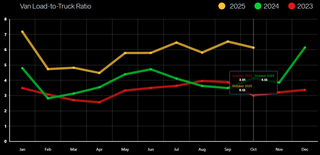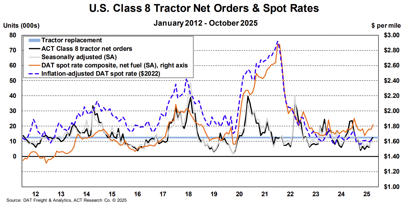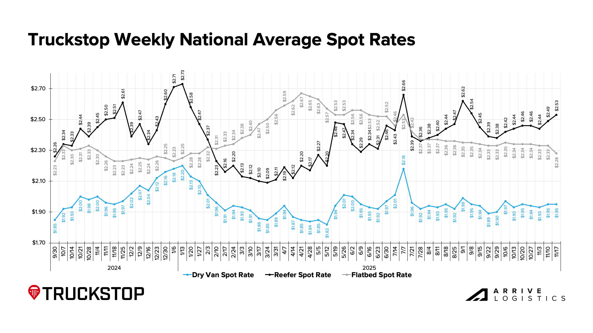 Volumes will likely remain soft through year-end, with volatility limited to typical seasonal patterns. That includes reefer tightness as holiday food demand rises, short weather-related bumps and van disruptions tied to annual capacity shutdowns in late December. Continued manufacturing contraction and a weak investment environment amid persistent tariff uncertainty remain the primary near-term downside risks to future volumes.