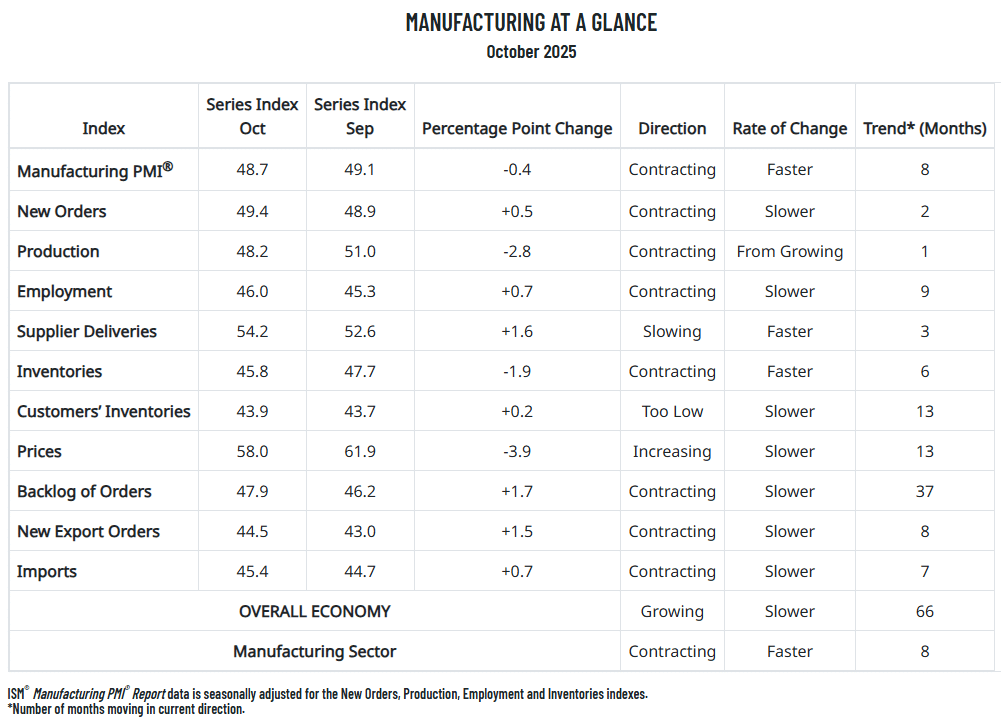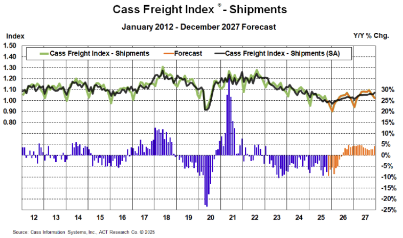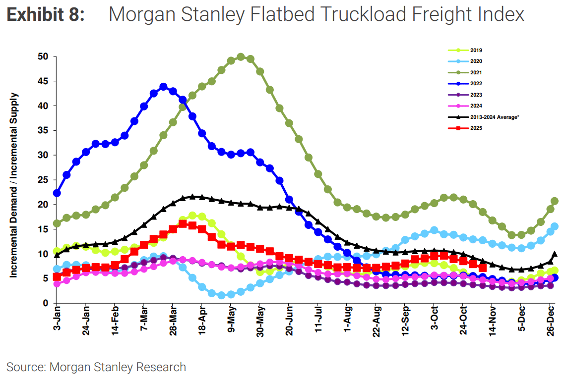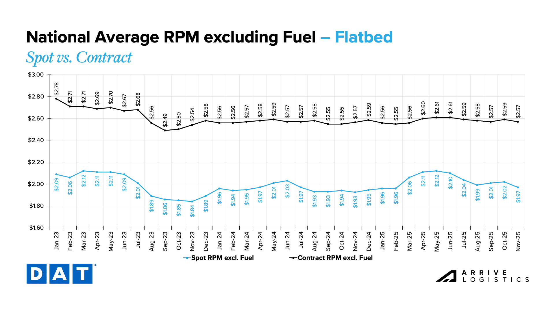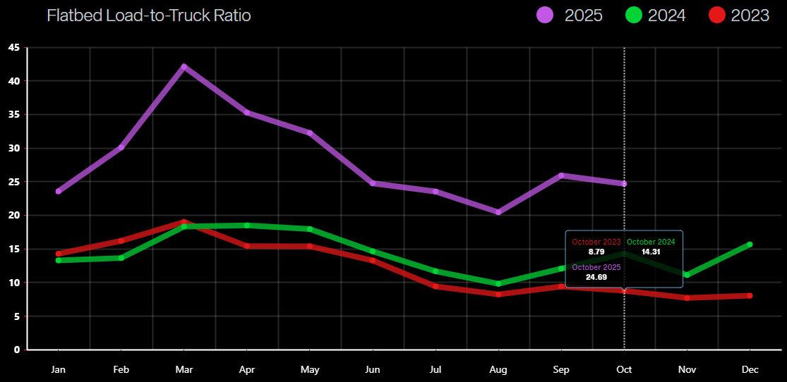 Volumes will likely remain soft through year-end, with volatility limited to typical seasonal patterns. That includes reefer tightness as holiday food demand rises, short weather-related bumps and van disruptions tied to annual capacity shutdowns in late December. Continued manufacturing contraction and a weak investment environment amid persistent tariff uncertainty remain the primary near-term downside risks to future volumes.