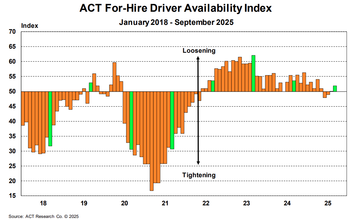 Volatility tied to Q3’s close and the late-September announcement of new non-domiciled CDL regulations has largely settled. Long-haul markets saw the greatest impact, though even that was muted.