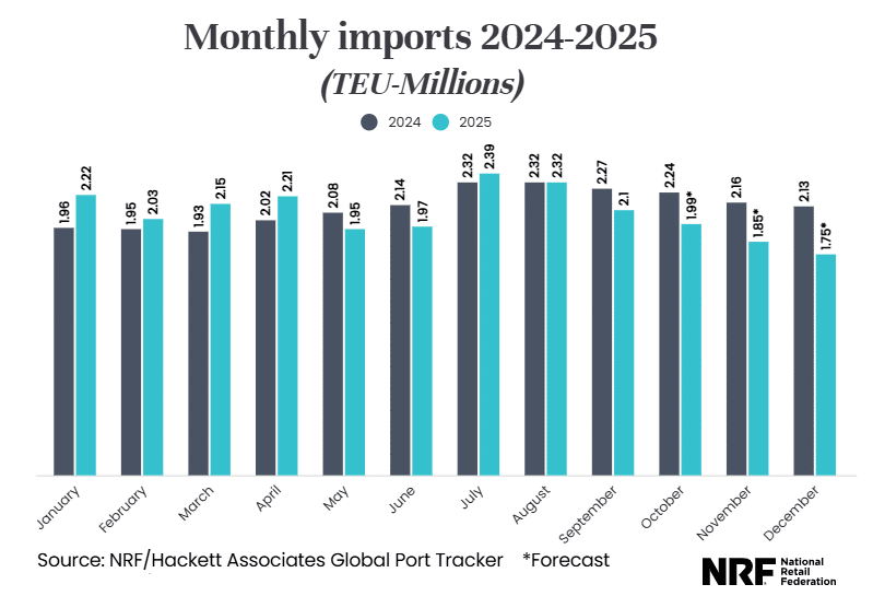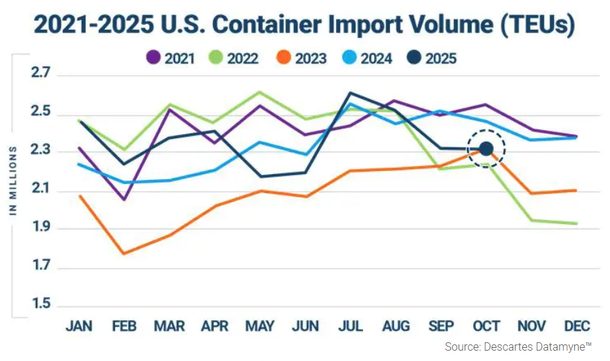 Import volumes remain soft due to the summer pull-forward surge that left shippers well-stocked long before typical peak season preparation began. With retail forecasts now pointing to declining volumes through year-end and manufacturing still contracting, meaningful near-term demand growth looks unlikely.