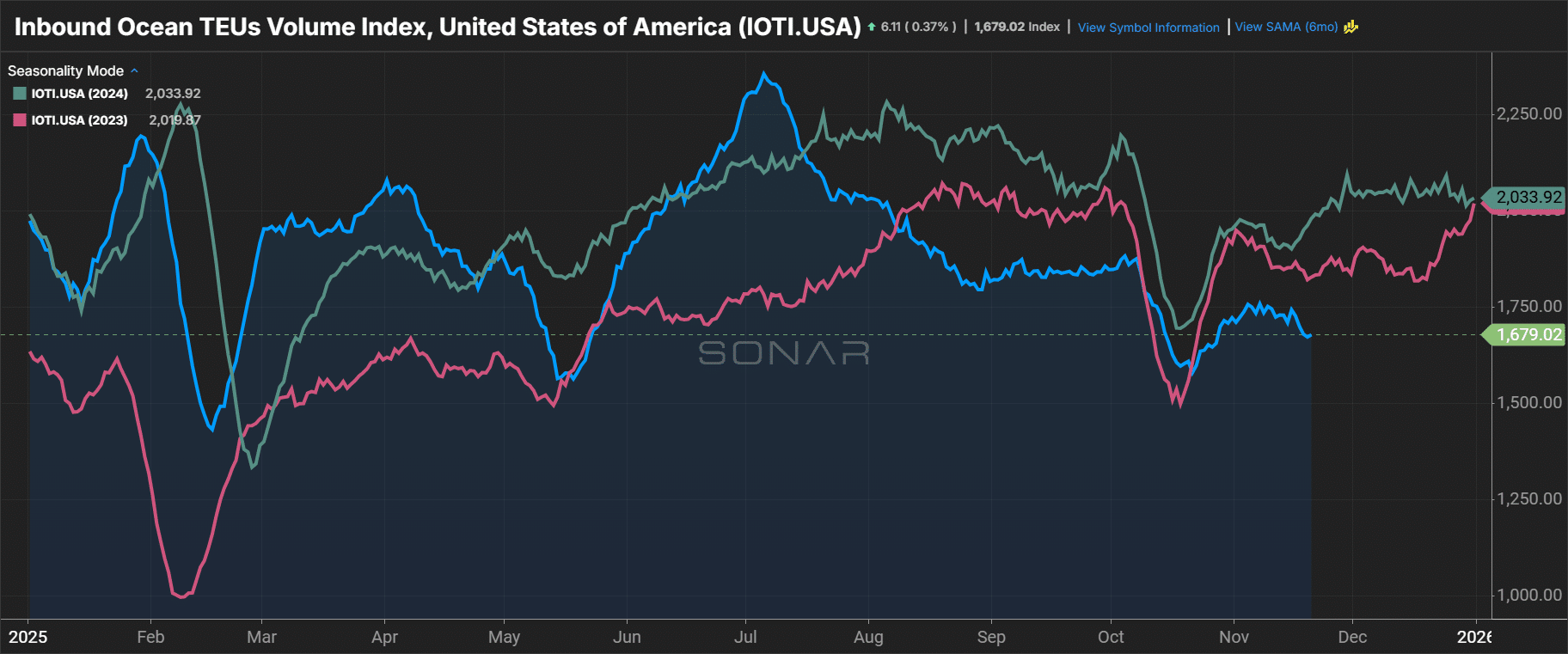 After early October’s short-lived volatility subsided, truckload demand weakness has held steady through mid-November. Contract volumes flattened after mid-month, and DAT showed a slight month-over-month dip in spot load posts, though year-over-year activity remained positive. Import-driven freight was soft for this time of year due to reduced peak-season ordering following earlier pull-forward efforts, and ongoing manufacturing contraction continued to weigh on volumes.