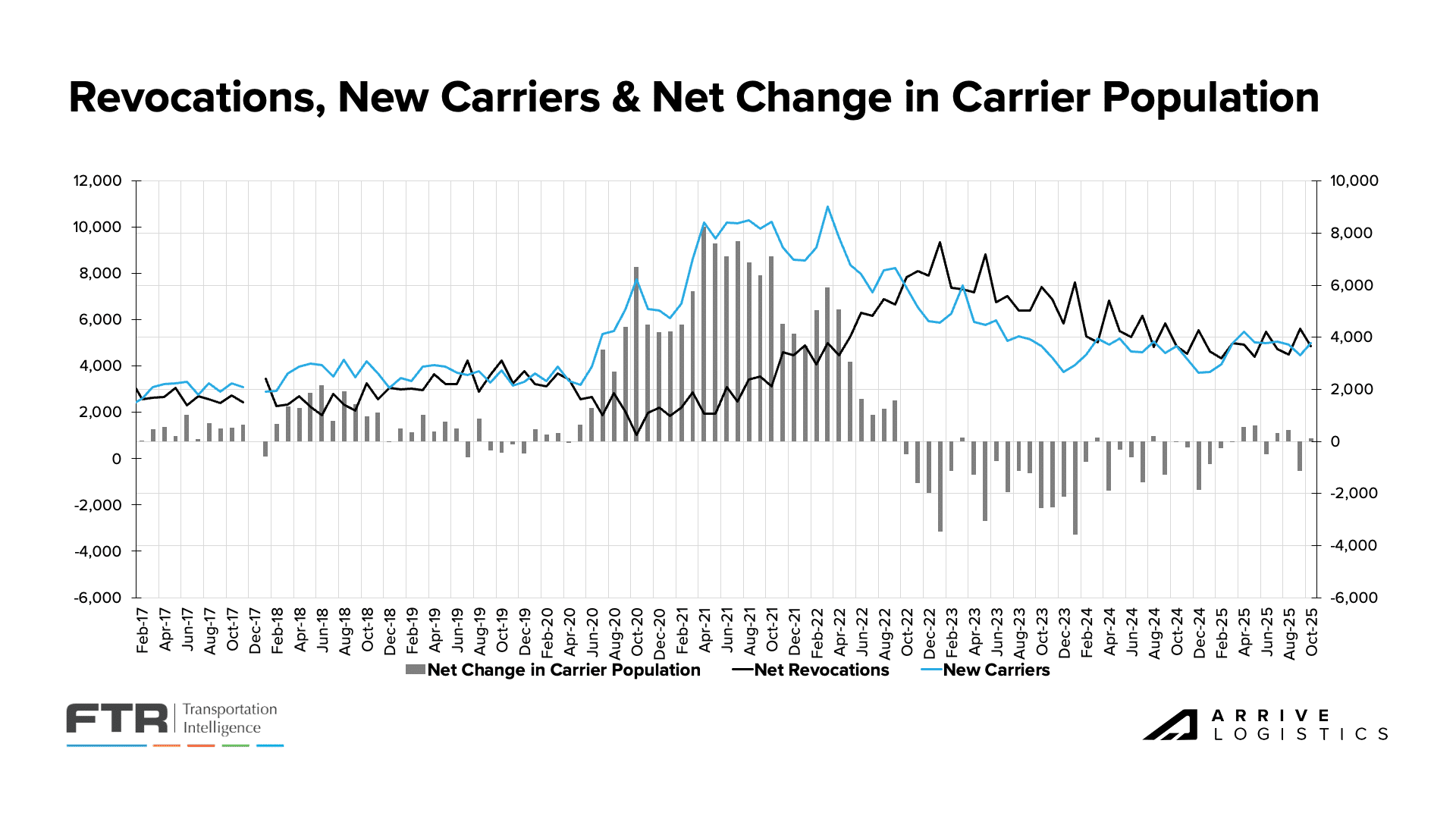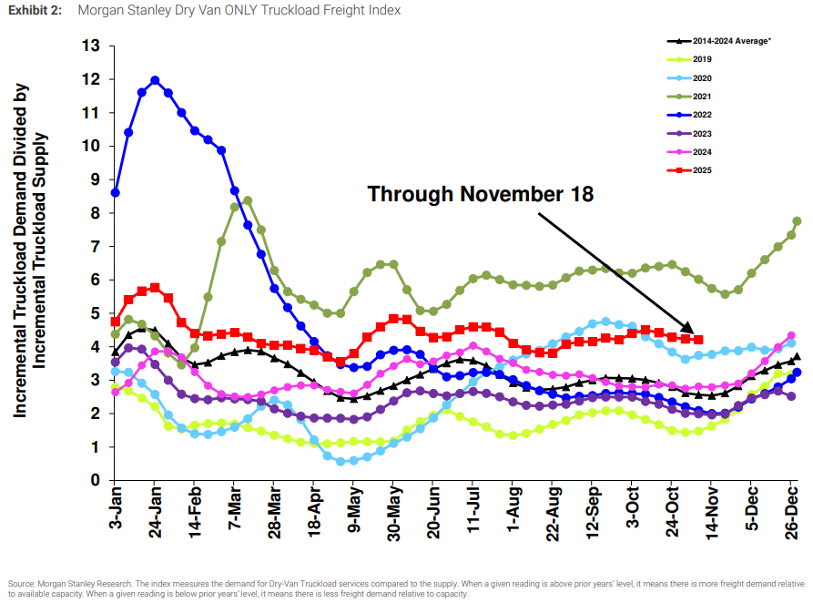 Despite low volumes, low rates and ongoing regulatory uncertainty, the capacity market is still oversupplied for now. Severe winter weather and drivers taking time off around the holidays are the primary near-term supply risks through year-end, but if equipment orders remain below replacement levels and CDL enforcement begins again, capacity could see challenges once demand turns upward.