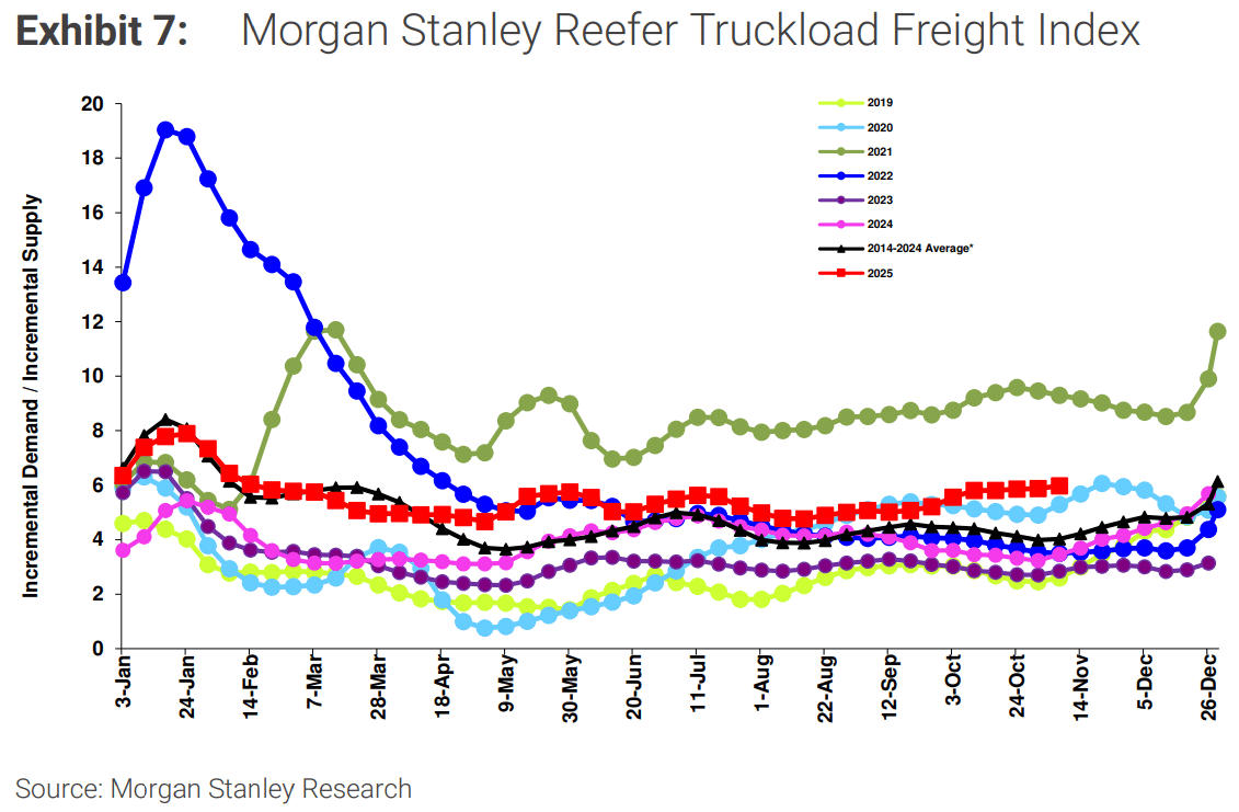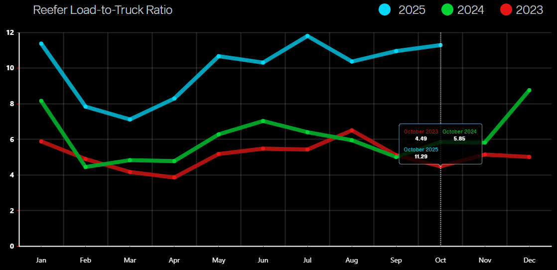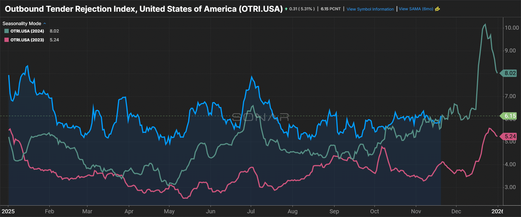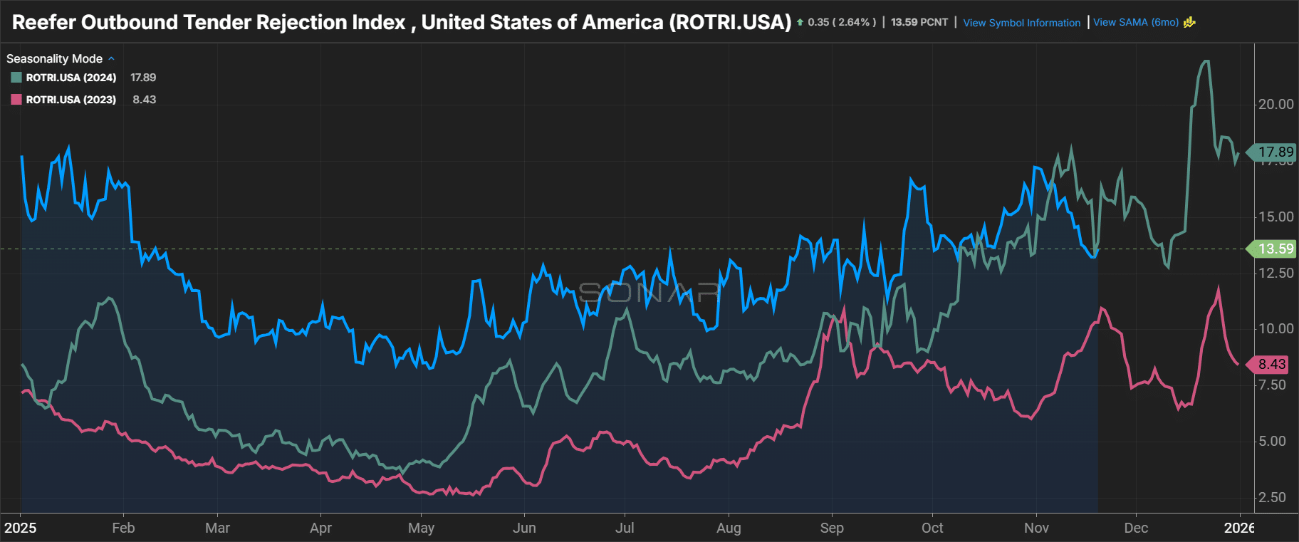 Reefer rejection rates followed normal seasonal patterns through October before falling in early November, with only pockets of tightness driven by seasonal food shipments and freeze-protect demand. With continued softness across other major modal markets, current capacity should easily cover short-term holiday or weather-related disruptions.