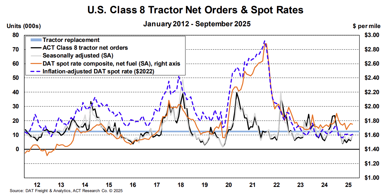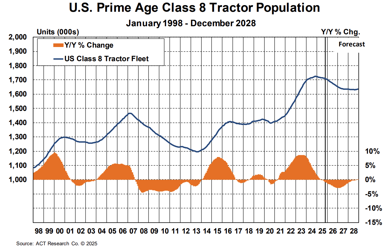 Capacity is expected to remain stable or contract slightly through the end of the year — but if low equipment orders persist amid a shrinking fleet base and aging equipment pool, available capacity will become increasingly vulnerable to future demand shocks.