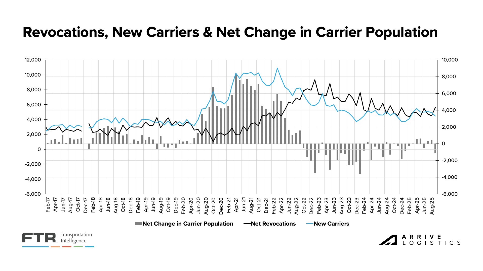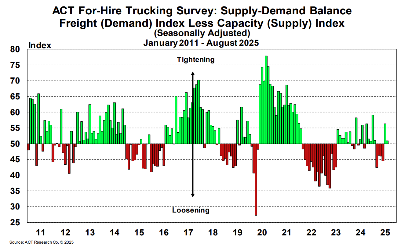 2025 has seen private fleets give back market share to for-hire carriers, presumably as investment in fleet growth slows. This is working to prop up for-hire demand and keep a portion of drivers in their seats amid persistently soft freight volumes and elevated operating costs. Together, these trends point to a supply side that is slowly tightening but still able to service current demand.