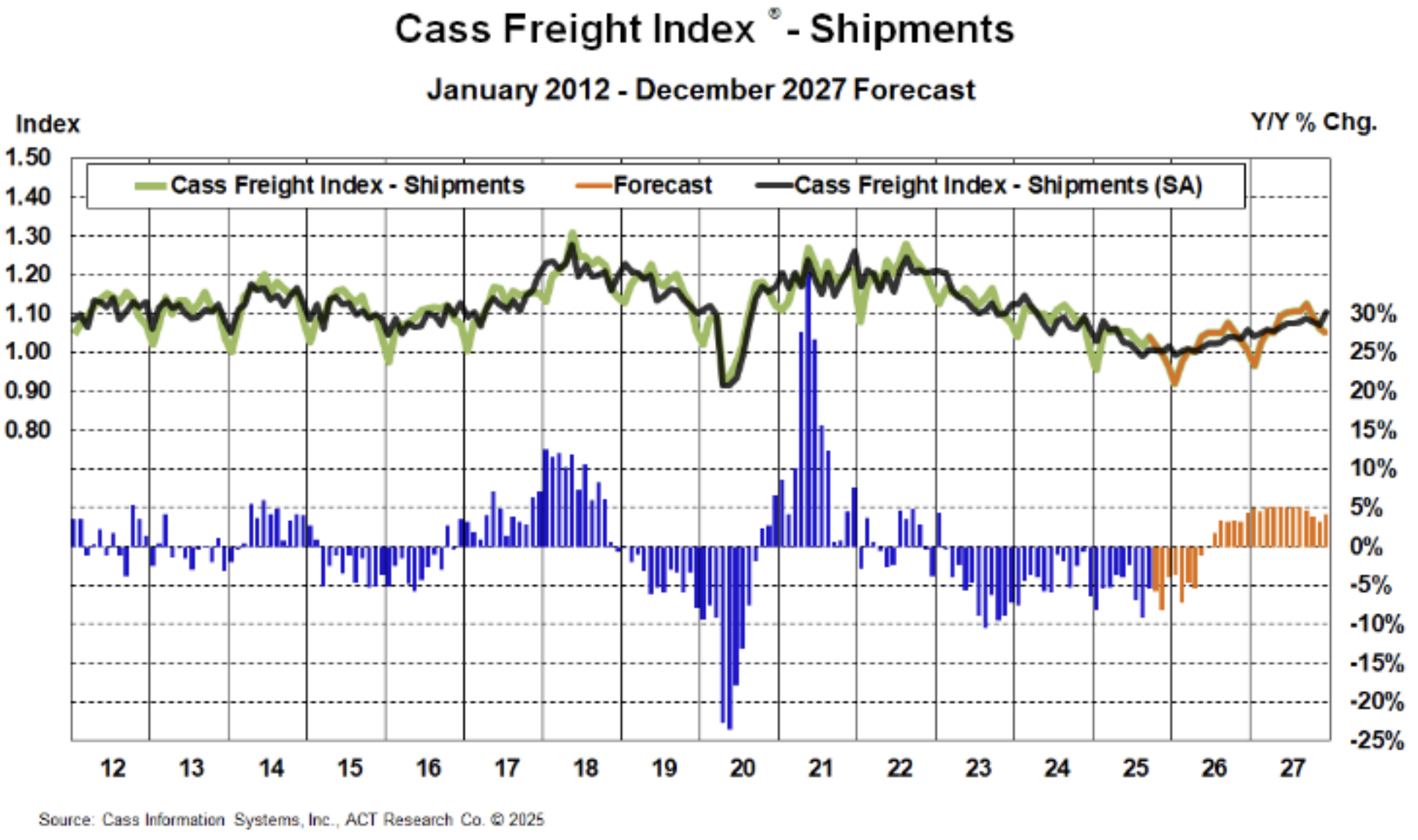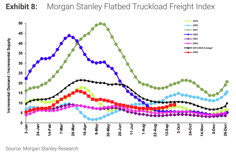 Economic conditions should help keep freight volumes at or near current levels. However, interest rates, inflation and labor uncertainty remain risks. Further rate cuts would help stimulate housing and durable goods demand, which in turn would greatly benefit freight volumes.