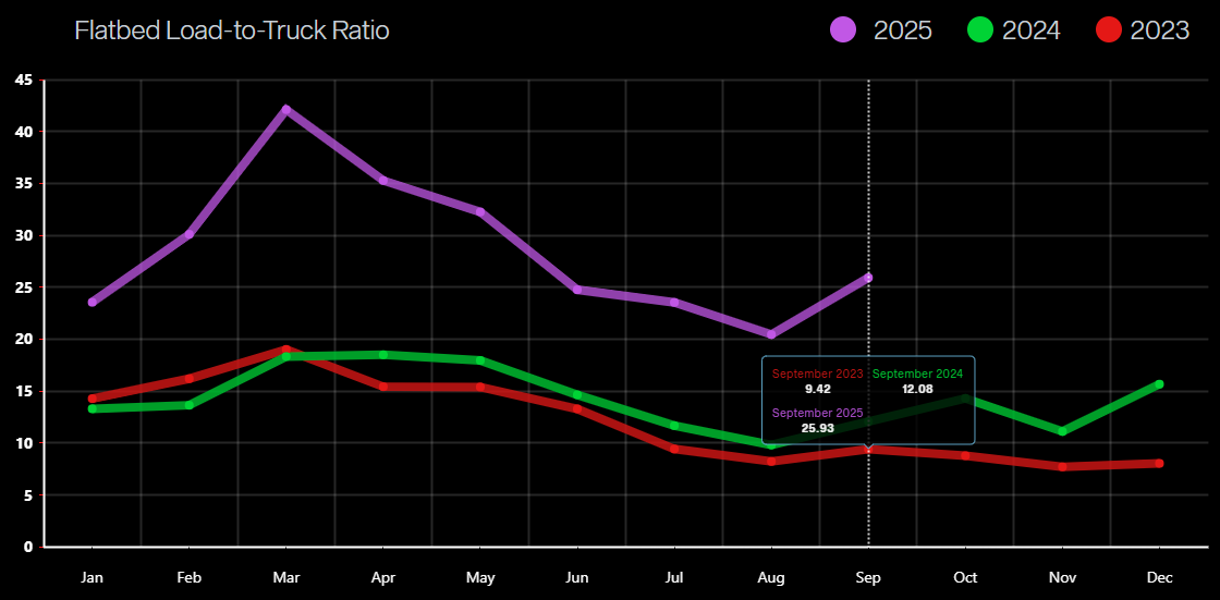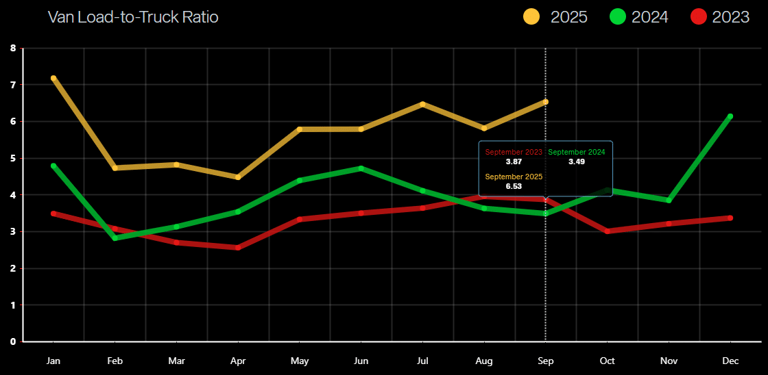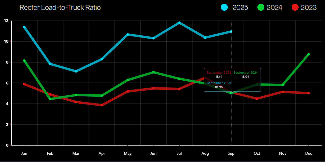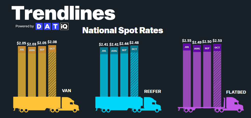 Rates followed typical seasonal patterns through September, with van and reefer markets both spiking around Labor Day before easing through the rest of the month. A brief rate bump also hit the market at the end of September and into early October, driven by disruption surrounding the non-domiciled CDL regulation.