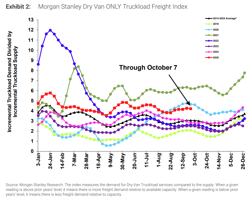That said, as we move into the back half of October, tender rejection trends are showing tightness outside of typical seasonal patterns. The Diwali holiday and recent driver exits are the likely culprits, but if the trend persists into November, it will be worth watching for signs of a broader disruption.