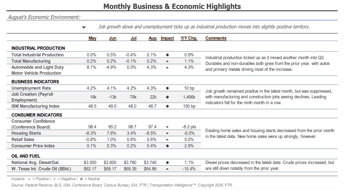 On the demand side, consumers are still spending amid labor market challenges, but inflation and higher borrowing costs will continue to weigh on durable goods volumes. Additional tariff threats are also creating further uncertainty, as limited visibility into the timing or scope of potential changes makes it challenging to anticipate how these factors will impact future freight volumes.