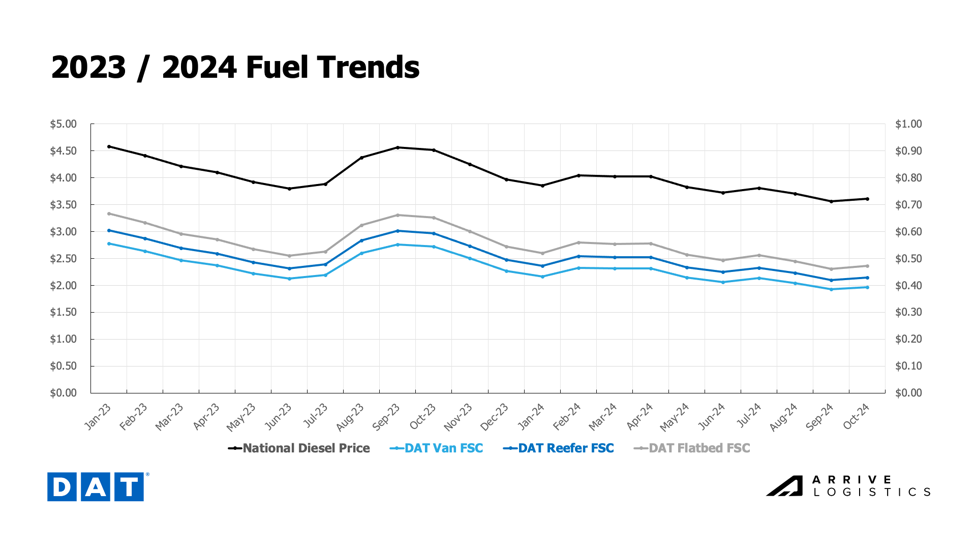 National diesel prices remain low but have ticked up in consecutive weeks, likely due to supply chain disruptions caused by Hurricanes Helene and Milton. Disruptions aside, fuel prices are steady, production remains strong and inventories are full. While current fuel prices should hold, winter weather and escalating conflicts in the Middle East remain risks.