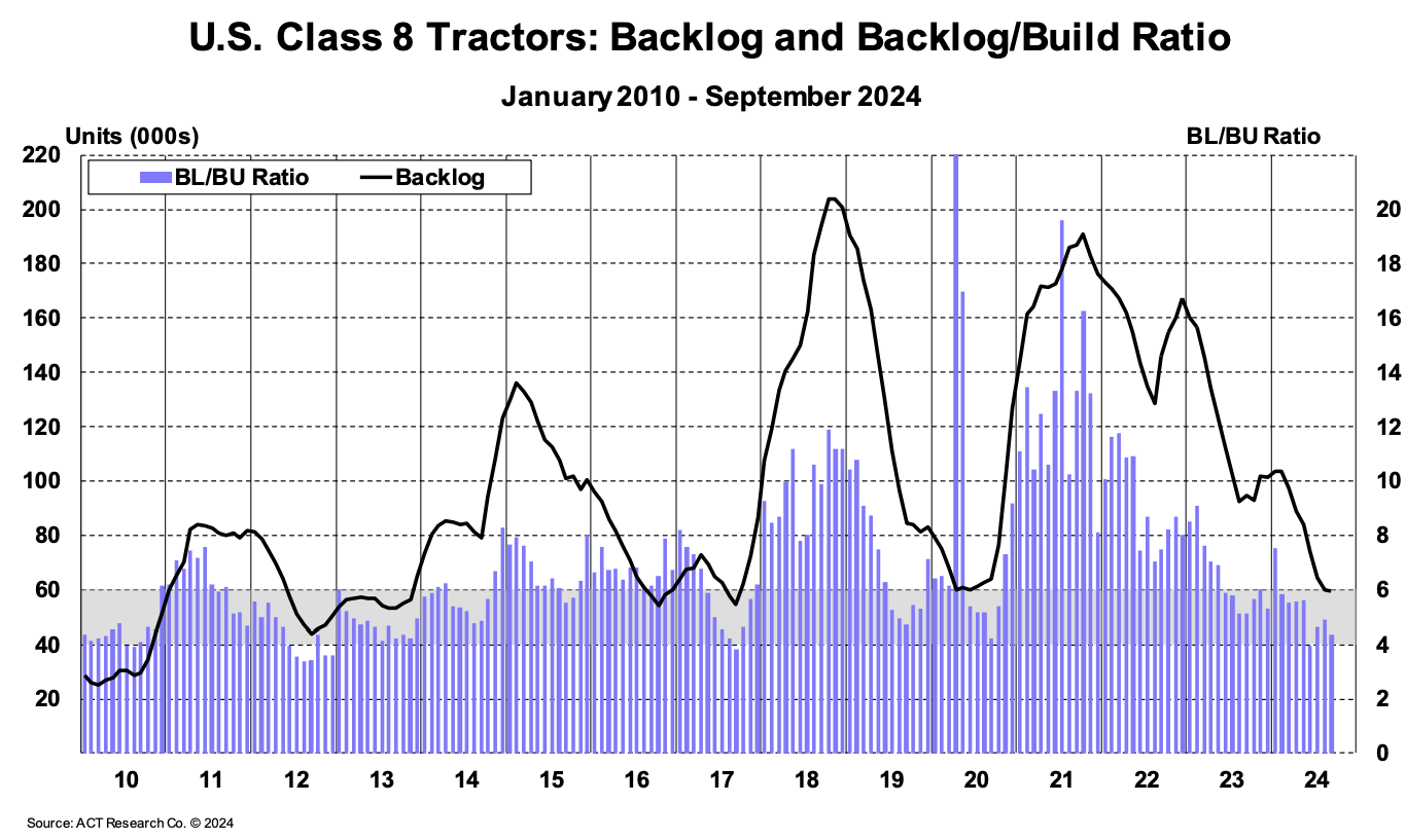 Based on the latest ACT Research data for U.S. Class 8 Tractors, the backlog-to-build (BL/BU) ratio fell from 4.9 months in August to 4.3 months in September, indicating that lower order rates continue to shrink the backlog. Despite experts forecasting a slow order season, backlogs may start to tick up as the season begins.