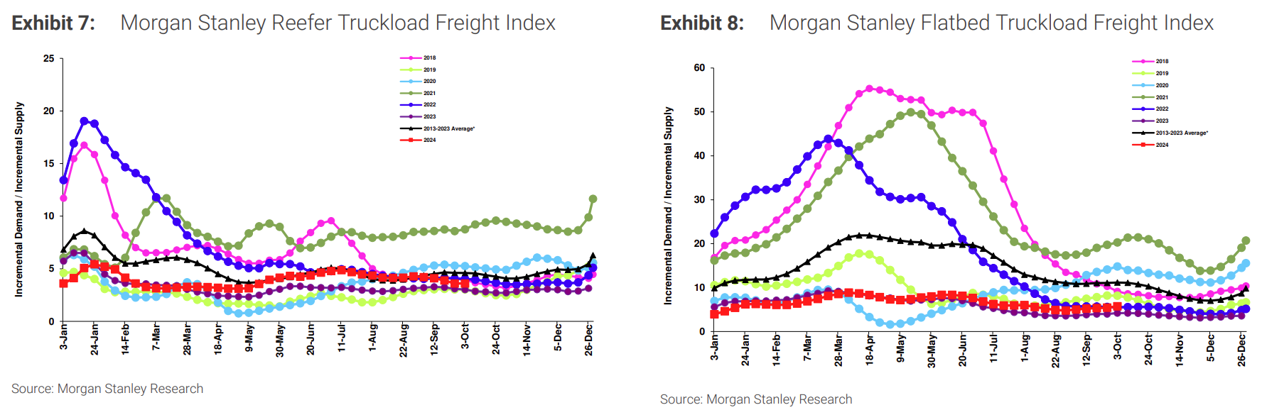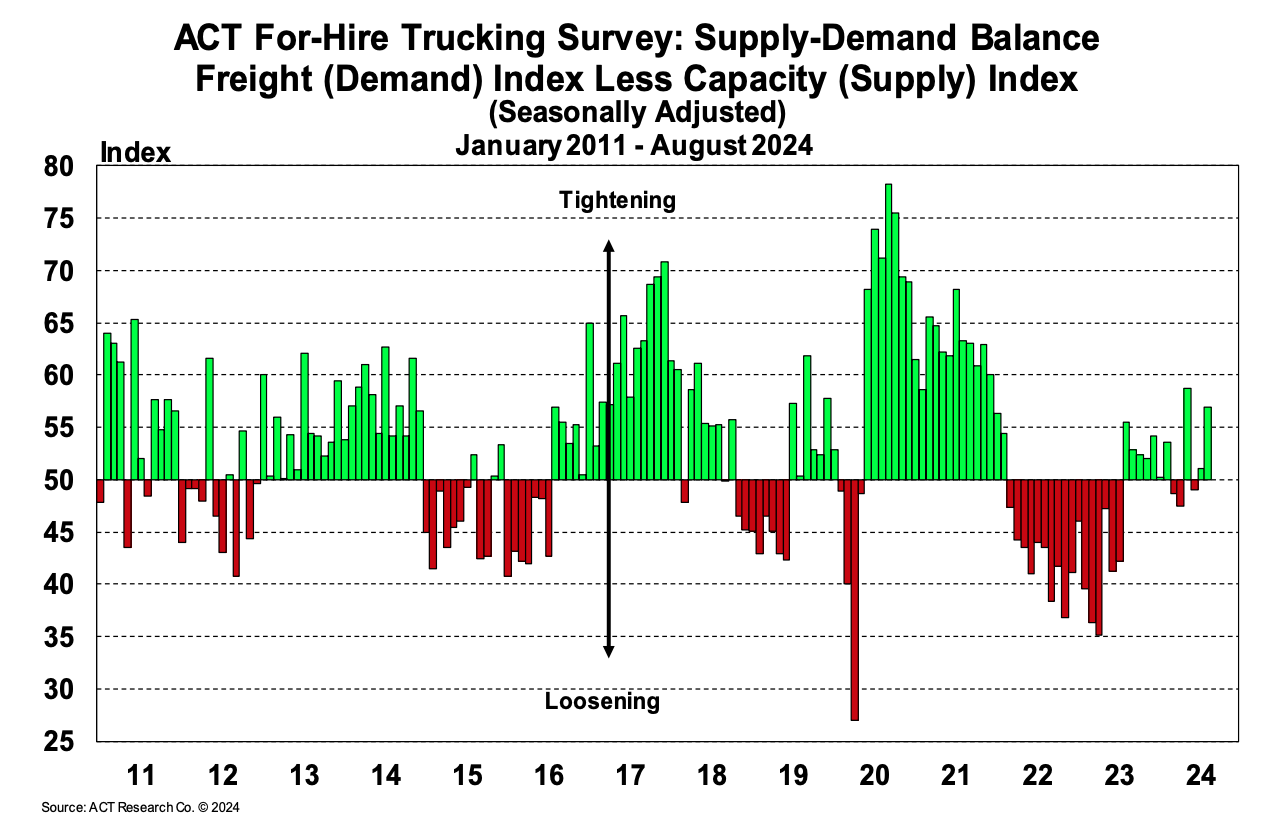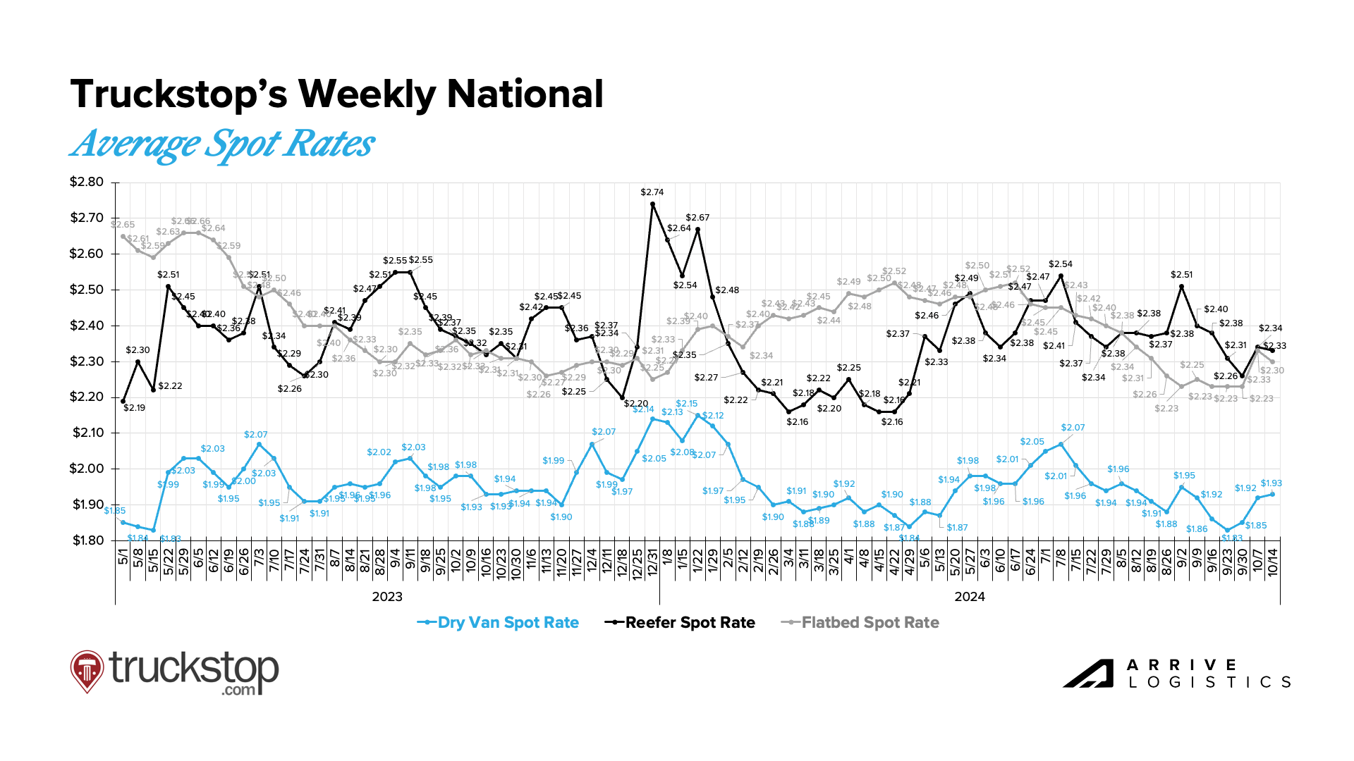 Hurricane Milton: Florida continues to navigate the fallout of Hurricane Milton. Regional inbound and outbound freight markets experienced significant disruption immediately following the storm but are normalizing as power is restored and repairs are made. The storm also did not meaningfully impact the long-term outlook for the national freight market.