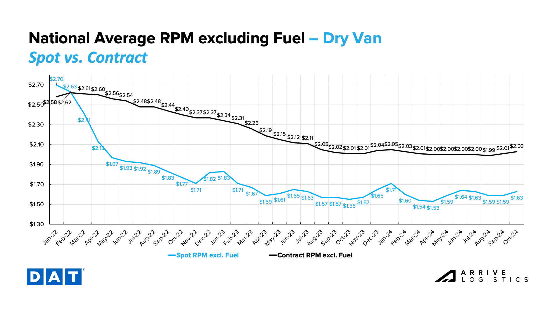Volatility hit the freight market in late September and early October due to the East and Gulf Coast port strikes and consecutive destructive hurricanes. However, the impact of these events was regionalized, and conditions normalized quickly as capacity easily absorbed the additional volume. Otherwise, demand remains stable, and capacity is abundant. As a result, the market continues to fluctuate in line with seasonal expectations, and major market movement is unlikely until mid-2025.