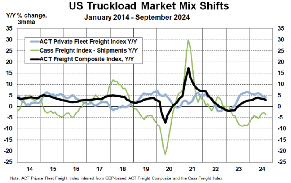 We continue to monitor the evolving role of private fleets as they increase their share of for-hire freight annually despite year-over-year shipment volume declines. With less freight available, for-hire carriers must negotiate aggressively on rates to maintain volume and revenue, which applies downward pressure on the market. If this trend continues and private fleet participation in the for-hire market grows, it could extend the current rate and supply environment.