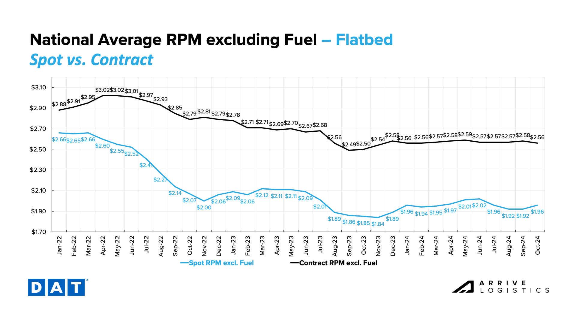 Flatbed rates remain relatively steady but rose slightly in early October, likely due to increased recovery-related demand in regions impacted by Hurricanes Helene and Milton. Contract rates are still well above spot rates at $2.56 per mile.