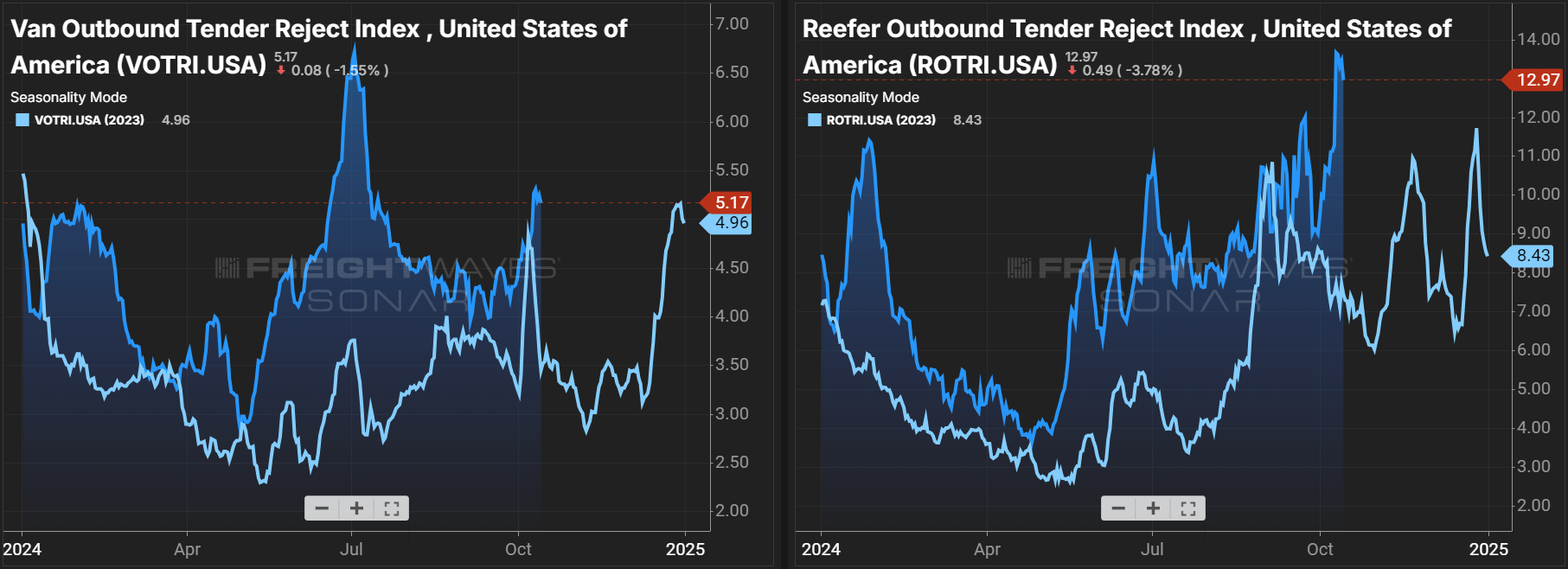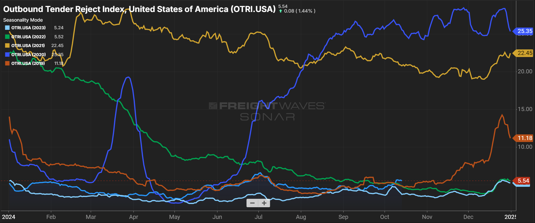 The Sonar Outbound Tender Reject Index (OTRI), which measures the rate at which carriers reject the freight they are contractually required to take, deviated slightly from 2023 trends. In October, demand typically eases, and capacity opens up. However, recent disruptive events caused regionalized volatility and a marginal increase in tender rejections at the national level. Conditions should continue to cool as November approaches, except for reefer markets, where tender rejections have reached the highest level in over two years.