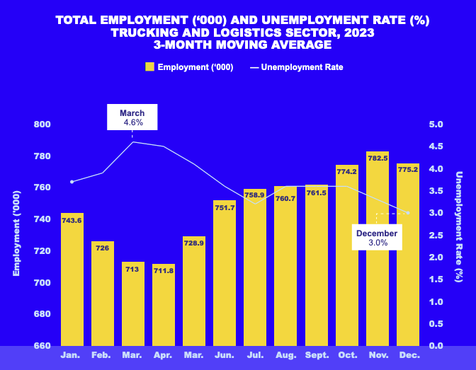 Despite fluctuating freight volumes, trucking and logistics sector unemployment declined steadily in Q4 2023, reaching the lowest rate of the year (3.0%) in December. Driver unemployment was slightly higher at 3.5%, but this was still a significant improvement from the 6.5% reading in April 2023. As persistently low rates and revenues drive more carriers out of the market, drivers may look for opportunities outside of the industry.